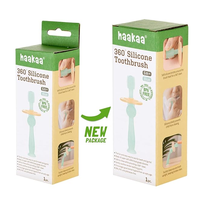 haakaa 360° Baby Toothbrush with Suction Base - Gentle Cleaning for Toddler's Self-Brushing Training, Food-Grade Silicone, Adjustable Safety Shield - Blue (1 Piece)