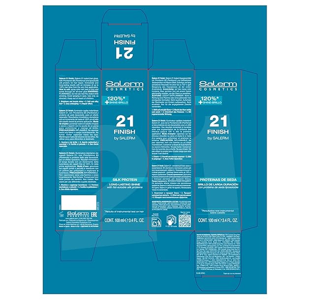 - ILLUMINATING HAIR SPRAY: Salerm 21 Finish is an illuminating spray that provides instant shine, hydration, and softness to all hair types. It offers a radiant and natural finish, perfectly complementing other products from the Salerm 21 family.