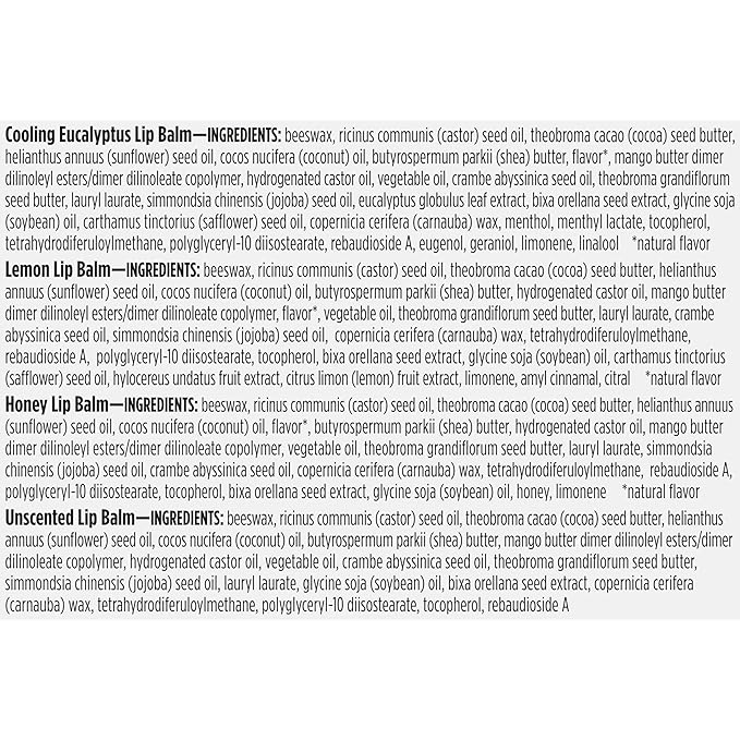 - MOISTURIZING LIP BALM: Four 0.15 oz. lip balm tubes of Burt's Bees Rescue Balm, with one tube each of Cooling Eucalyptus, Lemon, Honey and Unscented lip balm