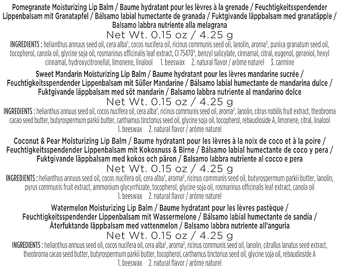 - FRUITY FLAVORS: With four flavors, including Pomegranate, Sweet Mandarin, Coconut and Pear, and Watermelon, this lip balm is a perfect gift for holidays like Valentine's Day, Easter and Mother's Day