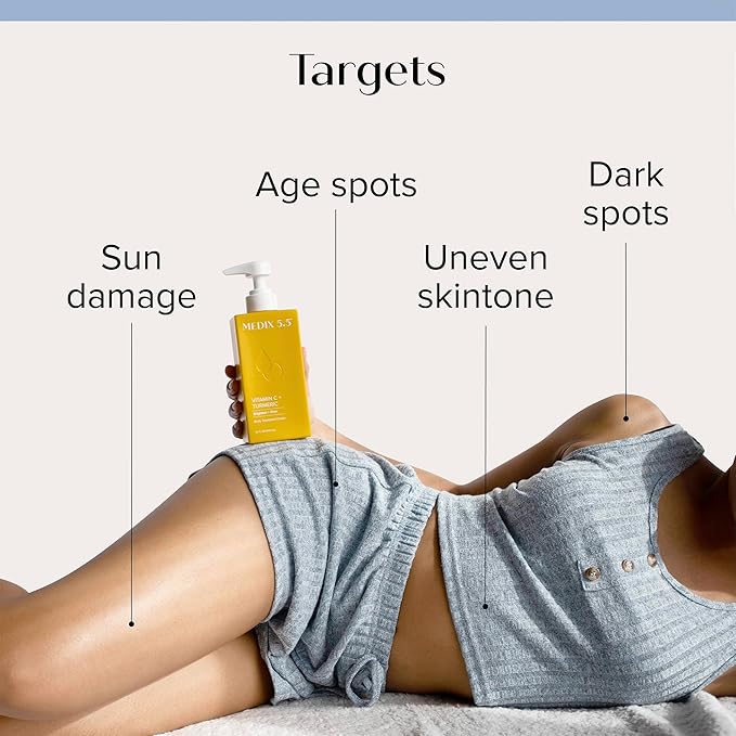 - EFFECTIVE INGREDIENTS – Medix 5.5 Vitamin C Cream Brighten + Firm Body Lotion is formulated with the perfect combination of effective anti aging + brightening ingredients, including Shea Butter, Aloe Vera, Ferulic Acid, Turmeric, Vitamin E, Glycerin, Ginger, & More. Shea Butter deeply moisturizes the skin, improves elasticity, & provides a protective barrier to help prevent moisture loss. Vitamin E helps protect skin against free radicals + UV Damage. Aloe Vera helps calm + hydrate the skin.