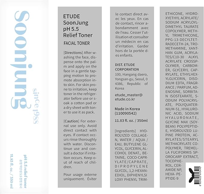 ETUDE Soonjung pH5.5 Relief Toner 11.83 fl.oz (350ml) 23AD | Skin Care Solution | Low PH Toner for Sensitive Skin | Non-Comedogenic, Hypoallergenic & Fragrance Free Moisturizer for Face