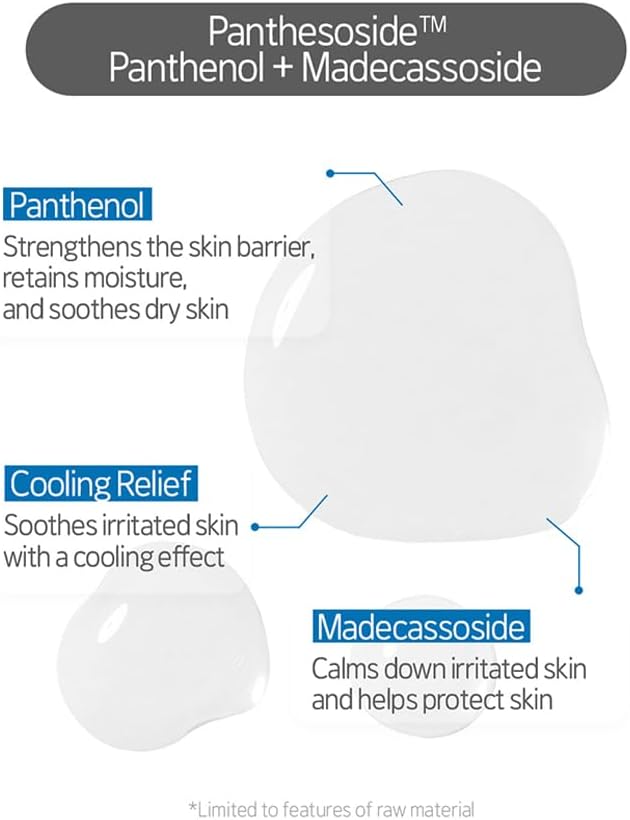 - Panthensoside Contained to Calm Skin: Panthenol(Strengthens skin barrier and soothes dry skin) + Madecassoside(Soothes irritated skin and protects skin from external stimuli)