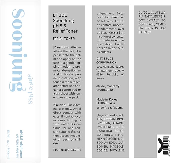 ETUDE Soonjung pH5.5 Relief Toner 16.9 fl.oz (500ml) 23AD | Skin Care Solution | Low PH Toner for Sensitive Skin | Non-Comedogenic, Hypoallergenic & Fragrance Free Moisturizer for Face