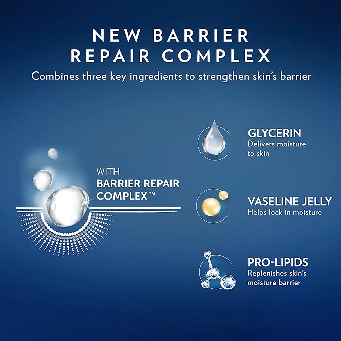 - INGREDIENTS FOR INTENSIVE CARE: This formula includes hydrating ingredients such as Vaseline Jelly, pro-lipids, and glycerin to fortify the skin’s barrier and support the natural repair process.