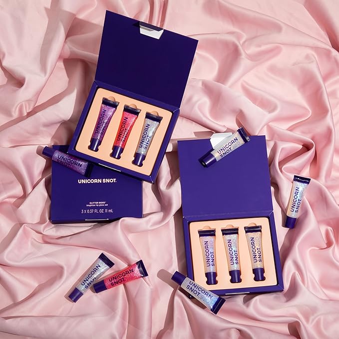 - High-Shine Lip Gloss Set: Unicorn Snot Glitter Boss Lip Gloss delivers a high-shine finish for bright, gorgeous lips. This sparkly lip gloss provides a smooth, moisturizing texture that doesn't feel sticky.