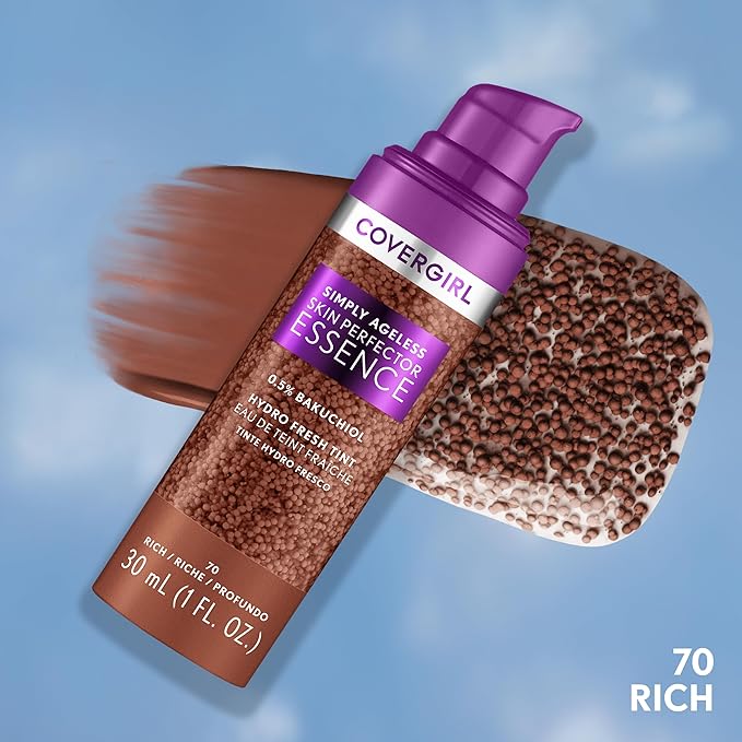 Covergirl Simply Ageless Skin Perfector Essence Foundation, 70 Rich, Tinted Skin Perfector, Skincare Makeup Hybrid, Sheer Tint, Radiant Finish, Skin-Like Finish, Vegan Formula, 1.0oz