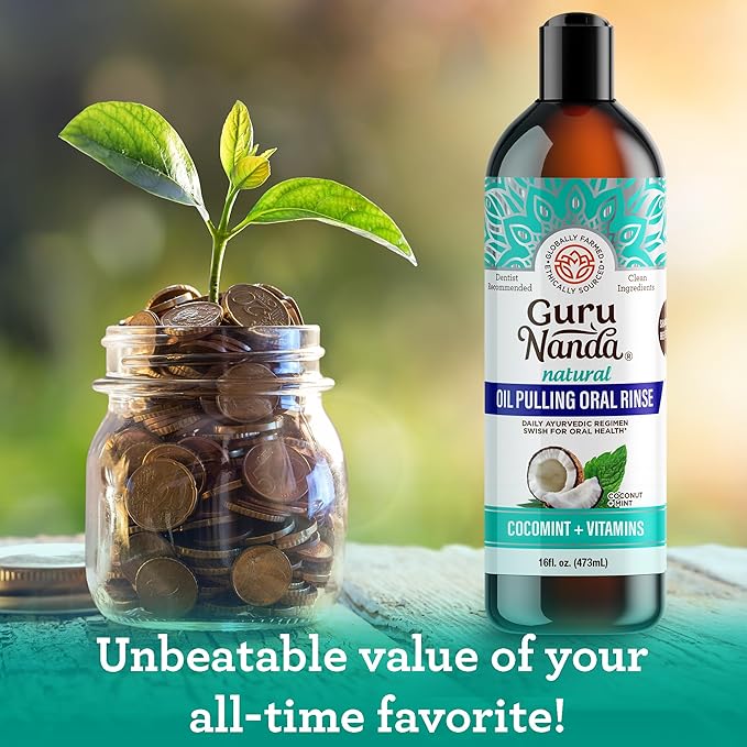 GuruNanda CocoMint Oil Pulling Mouthwash for Complete Oral Hygiene, 7 Essential Oils & Vitamins for Happy Teeth & Gums & Fresh Breath, Alcohol-Free, 16 oz