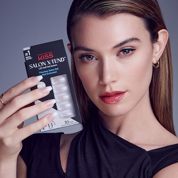 KISS Salon X-tend, Press-On Nails, Nail glue included, 'Words', Light White, Medium Size, Coffin Shape, Includes 30 Nails, 5Ml Led Soft Gel Adhesive, 1 Manicure Stick, 1 New Mini File, New Prep Pad