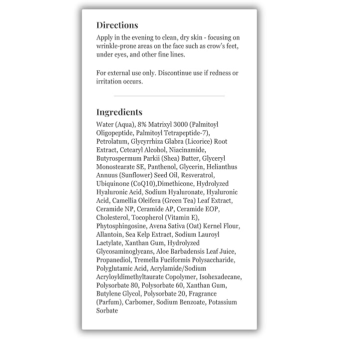 - [Serum 1 - Peptide Complex 8% Matrixyl 3000] - For Firmer, Softer and Supple skin without the irritation, Matrixyl 3000 is one of the most studied Anti-Aging Peptide Complex without the peeling and sensitivity from Retinoids. This Night Cream can also be layered under retinoids and retinol for an enhanced Anti Aging Effect. Matrixyl 3000 can also deeply hydrate your skin to reveal signs of softened fine lines.