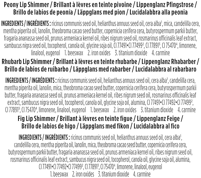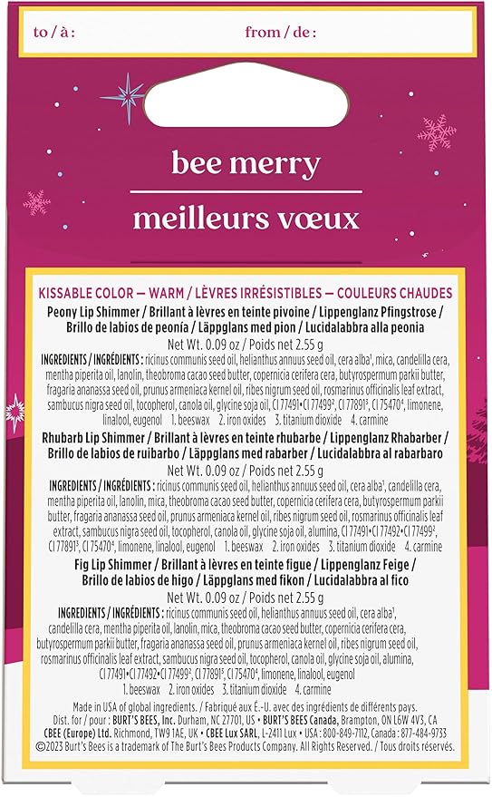 - PACKAGE CONTENTS: Each Burt’s Bees Gift Set contains three 0.09 oz. tubes of Burt's Bees Lip Shimmer, with one tube each of Peony, Rhubarb and Fig