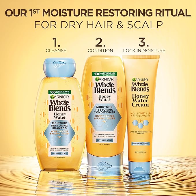 Garnier Whole Blends Honey Water Moisture Restoring Shampoo, Hair Care for Dry Hair and Dry Scalp with Honey Nectar and Floral Water, 28 Fl Oz