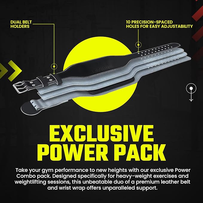 - THE ULTIMATE POWER COMBO : Take your gym performance to new heights with our exclusive Power Combo pack. Designed specifically for heavy-weight exercises and weightlifting sessions, this unbeatable duo of a premium leather belt and wrist wrap offers unparalleled support. Crafted with meticulous attention to detail, these accessories are built to withstand the toughest workouts, empowering you to surpass your limits and elevate your fitness journey.