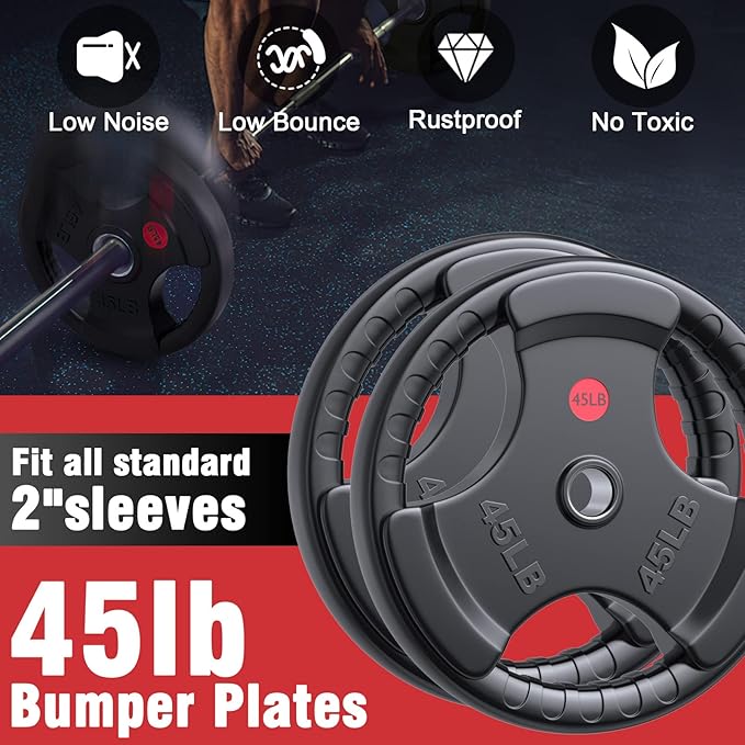 - Easy Grip - Each rubber weight plates has 3 large openings, easier grip to carry and loading & unloading, labeled in LB on the surface for fast recognition. Single plate is also great for warm up.