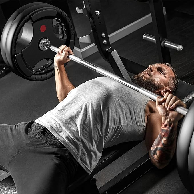- More Durable Construction - Constructed of solid cast iron core and recycled rubber coated, our Olympic weight plates is more thicker and won't bend for long-lasting use. Stainless steel inserts slide on and off weight bars with ease.