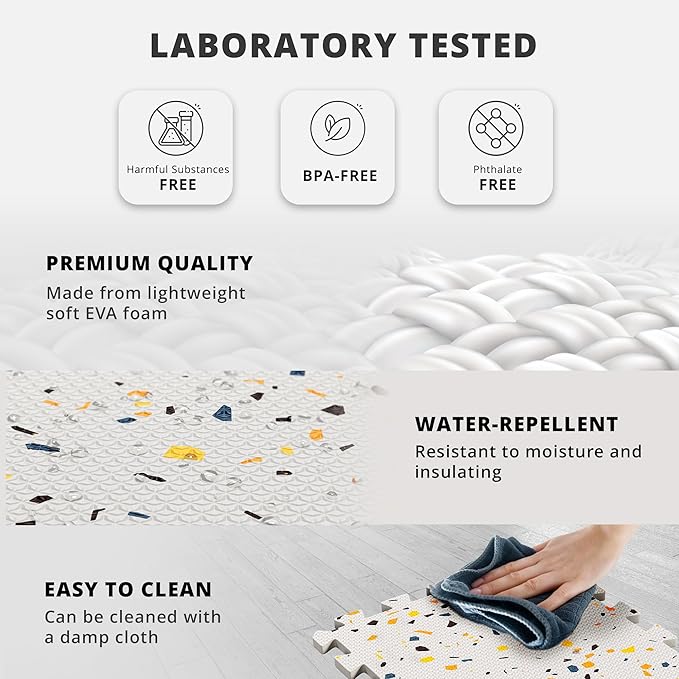 - 💪 𝗛𝗜𝗚𝗛-𝗤𝗨𝗔𝗟𝗜𝗧𝗬, 𝗗𝗨𝗥𝗔𝗕𝗟𝗘, 𝗥𝗘𝗟𝗜𝗔𝗕𝗟𝗘 - the highly compressed, environmentally friendly, non-toxic EVA foam with anti-slip surface is perfect as floor layering for fitness and gym spaces, under sports equipment, work spaces, garages, basements and more. The mat's premium lightweight material also makes it noise- and impact-dampening, warmth-insulating, waterproof, long-lasting and easy to clean with soap and water.
